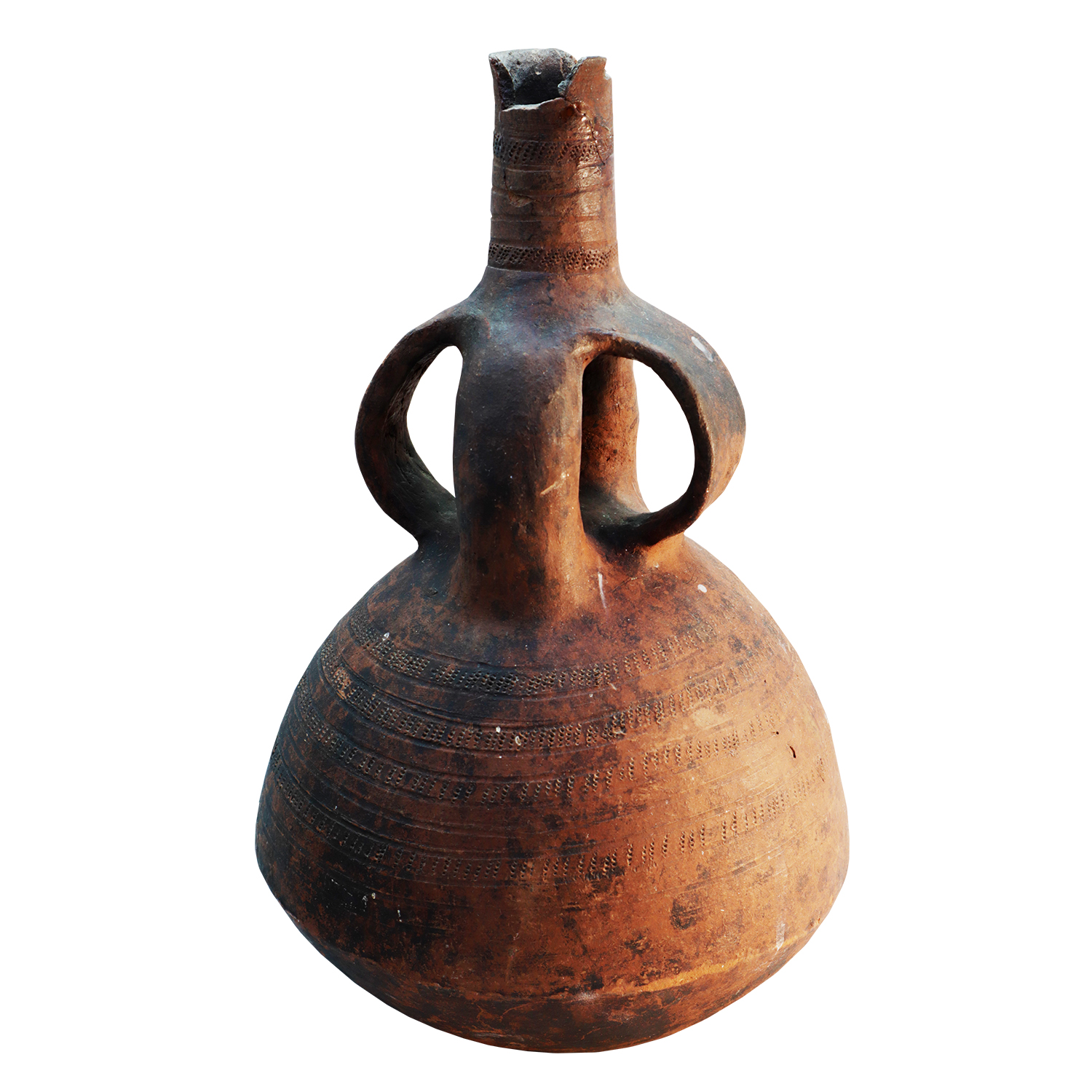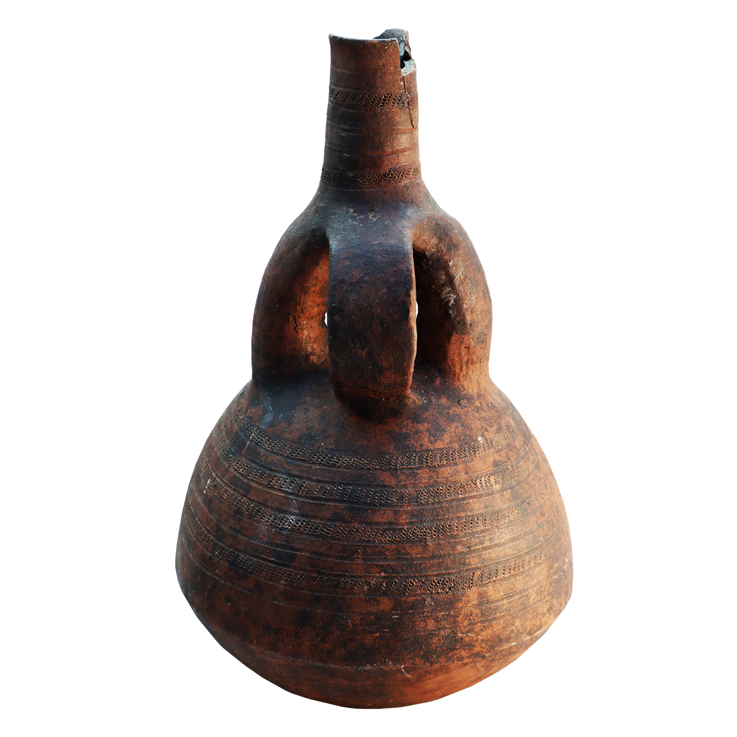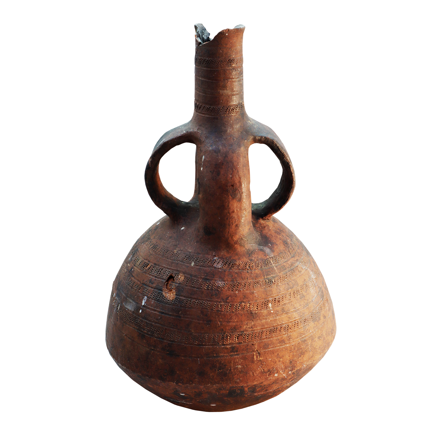 An aged and unique looking terracotta pot which is a type of fired clay hence the name terracotta which comes from the Italian words for “baked earth”. Typically they have a brownish-red color and can be used as an ornament or a drinking vessel.